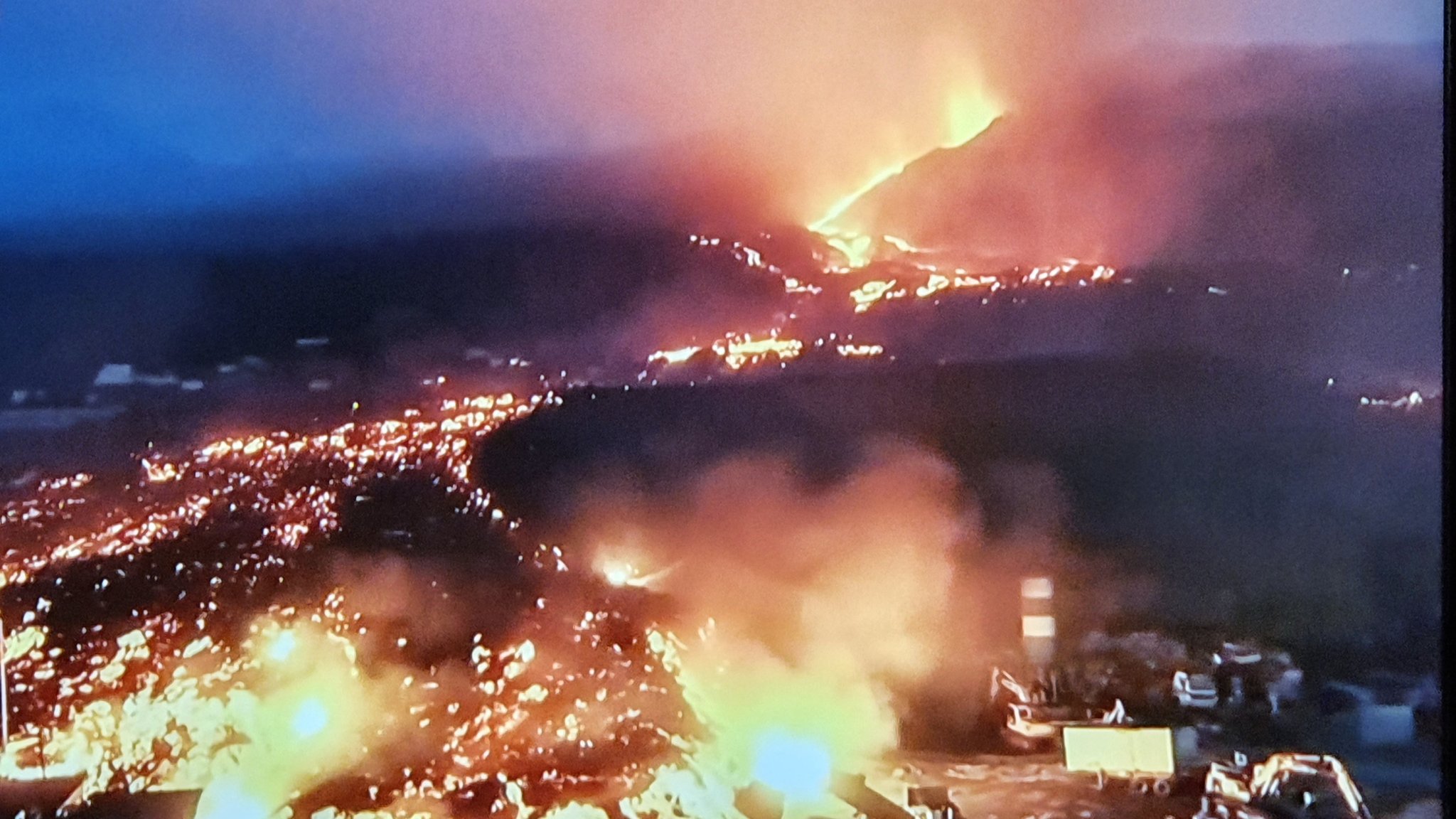 There goes another water reservoir. The lava in this image is advancing north of the Montaña de Todoque. Lava will thus one day flow into the sea again, from the north side of this 2k year old cinder cone.