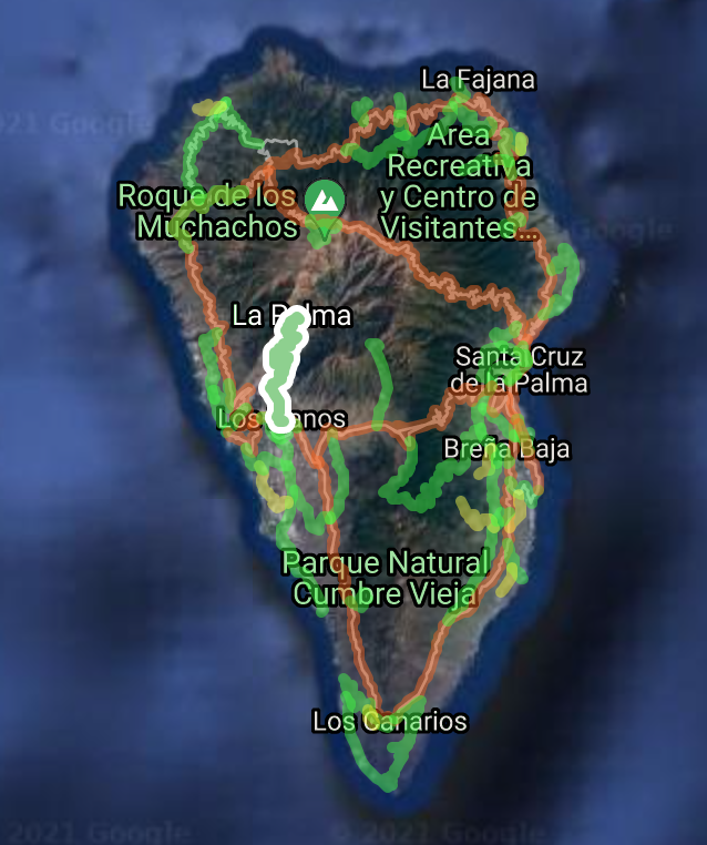 Volcanic activity in the southern half of the island has been ongoing for at least 125,000 years and has constructed another volcano known as Cumbre Vieja, or also simply as Dorsal Sur, “Southern Ridge”. It is a shaped like a ridge in a N-S direction. Despite being different edifices it seems that Cumbre Vieja is part of Taburiente’s structure. Taburiente had 5 subtle radial rifts. This is much better appreciated in submarine shield volcanoes which are often shaped like ridges or like three to six-pointed stars. Knowing well the shape of submarine volcanoes I can see that Taburiente displays the same five-pointed star structure, although being subaerial it is not so easily visible. The longest, dominant rift goes southward, known as Cumbre Nueva. It can be seen that Cumbre Vieja is the southern continuation of Cumbre Nueva.