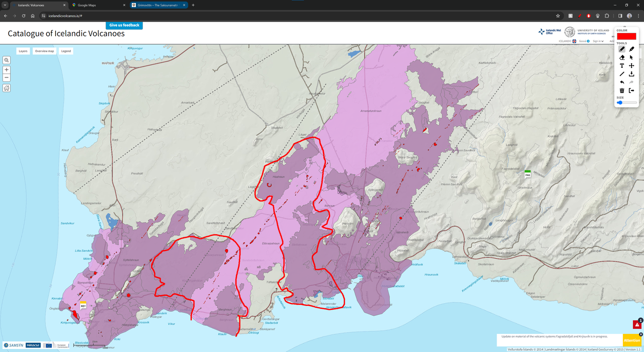 The border between systems on Reykjanes peninsula is maybe gradually. If we look f.e. on Gjalp 1996, it was a partially Grimsvötn and partially Bardarbunga eruption. Fagradalsfjall has prehistorical craters and fissures on the north-western side of the plateau towards Svartsengi’s Dalahraun. These fissures/craters are more than the 2021-2023 fissures leaning to Svartsengi’s system. They can possibly act as intermediate volcanic fissures/craters between Fagra and Svartsengi like Gjalp between Grimsvötn and Bardarbunga.