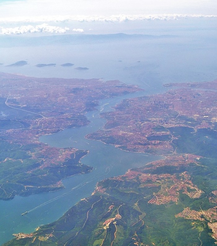 The Bosporus, with the Marmara Sea and the Kizil Islands in the background and the city of Istanbul along the shoreline. Source: Wikipedia