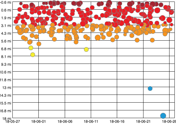 This is a plot of all the earthquakes along the rift zone (excluding the caldera and its environment). It goes from south of Kilauea to the tip of Puna. You can see that during June the earthquake activity appears to be decreasing a little, and the shallowest quakes (above sea level) have stopped over the last week. Perhaps the deeper quakes (4-6 miles) also but this may be affected by the stronger quake that occured at this depth around June 20. It may be (speculation alert) that the pressure in the dike is decreasing a bit.