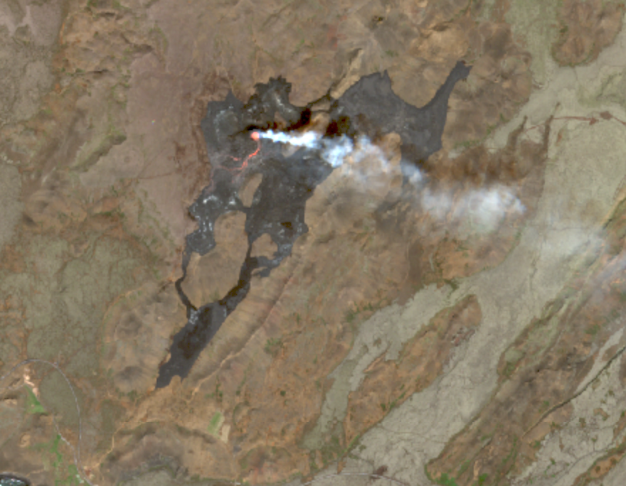 And here with infrared colours added showing the active lava flows. As can be seen, most is in Meradalir but there is also a stream moving south which doesn’t get very far but if it continues should go to Natthagi.