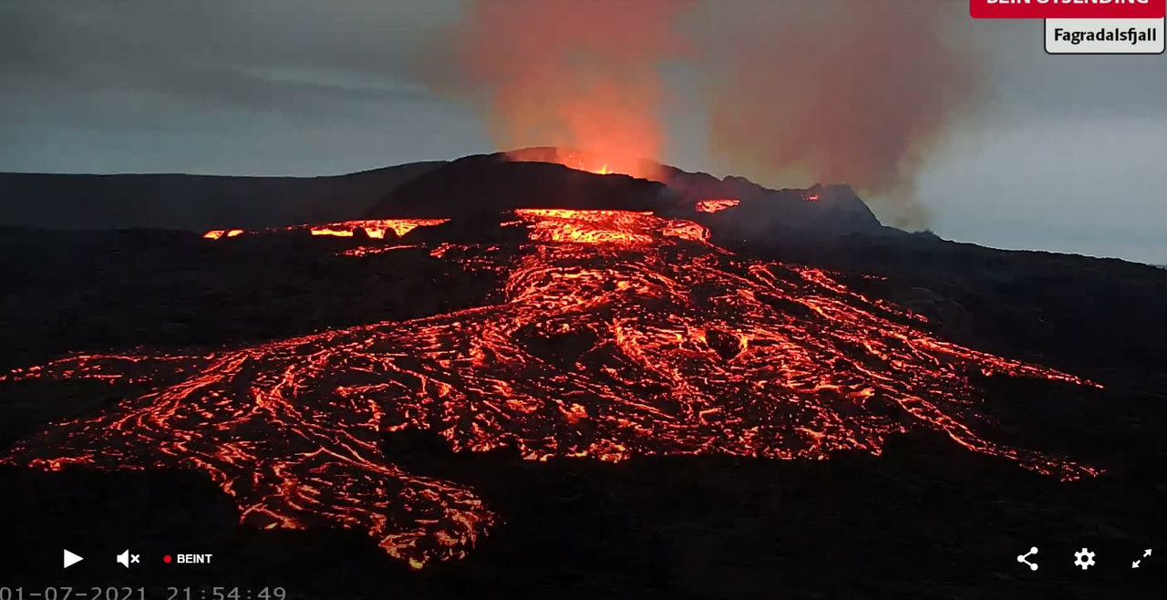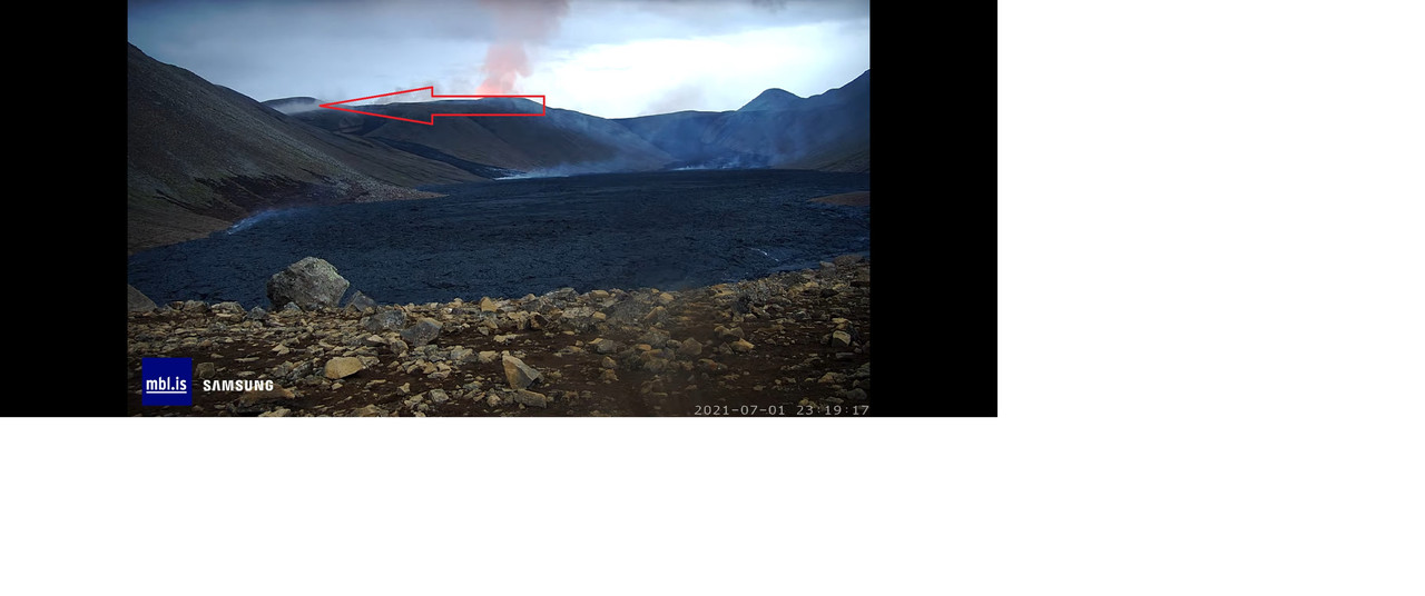 The vent is chucking lava out right now. And, looking at the Natthagi Valley webcam I notice a suspicious inflow of smoke from the are where the Civil Defence have built the retaining wall to stop the Geldingaladur lava flow from dropping over the edge of the hill.