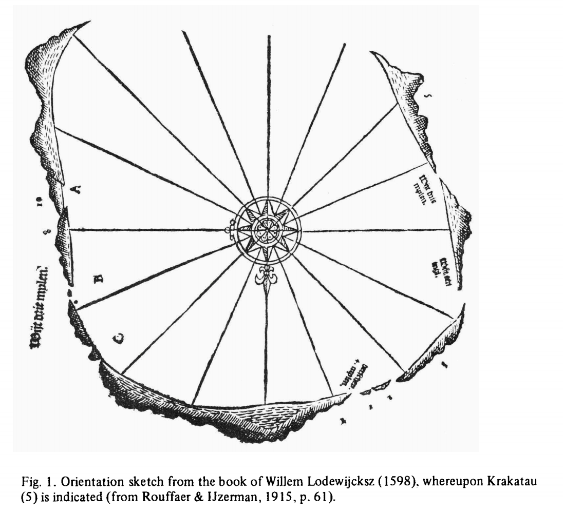 Krak1598 Published 10/05/2019 at 1096 × 1000 in Krak1598 ← Previous Next → Willem Lodewijcksz, 1598. Krakatau is top right, and is shown in profile with its three main peaks. (Source: https://www.repository.naturalis.nl/document/148698/)