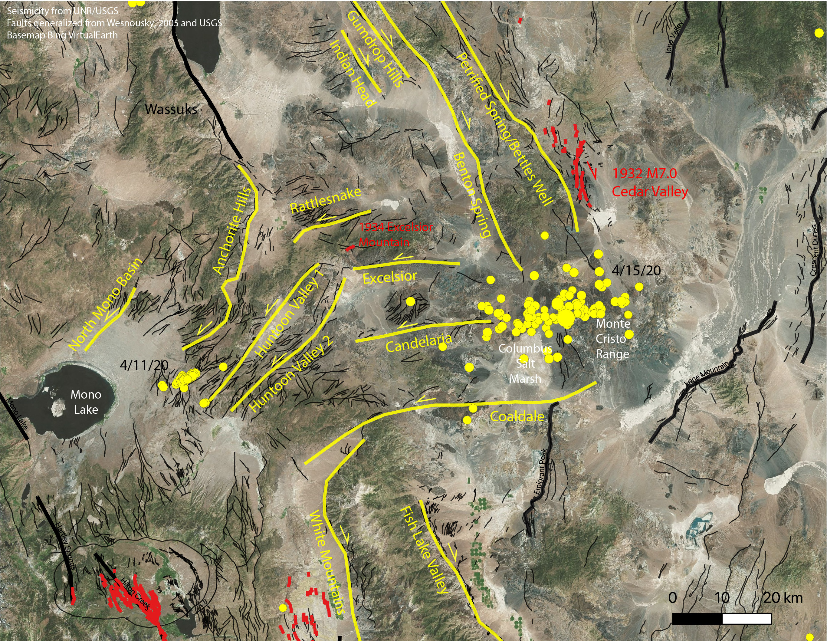 The lack of a legend on this is unfortunate. What magnitude quakes are the different sizes of yellow circles? What are the smaller green dots off to one side of the Fish Lake Valley fault? What does the fault color (yellow, red, or black) signify? Unfortunately we’re left to guess. At least they didn’t forget the scale. 🙂