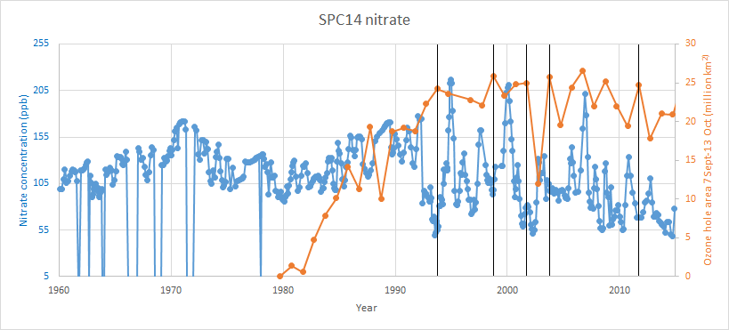 Regarding the nitrate, it may be useful to know that the typical concentration in the SPC14 core is about 80-100 ppb; it does peak in summer, but this is very variable, very rarely there can be 20 ppb annual variation (between local summer and winter) but normally it is less, and often imperceptible or practically imperceptible at a few ppb or less, so it’s likely that most nitrate is far-travelled. Volcanic nitrate drops can be very large, up to 30 ppb, which is far more than the usual annual variability in nitrate concentration.