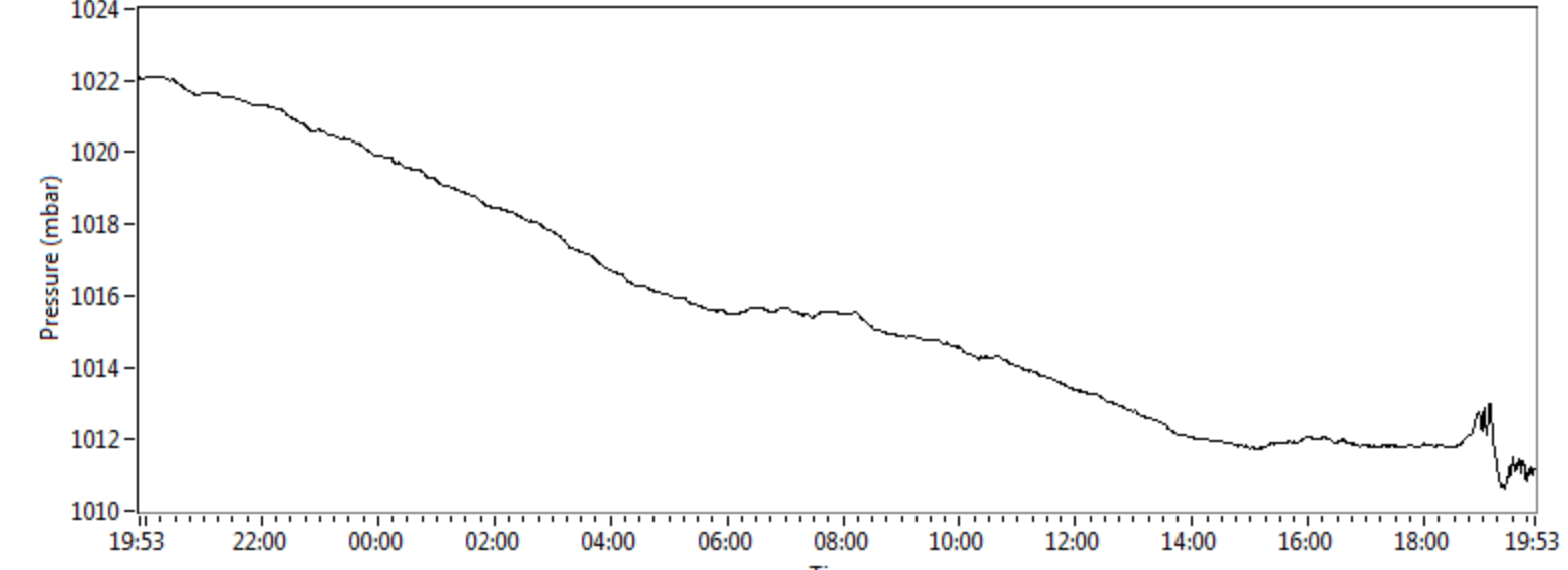The pressure wave passed us in the past hour. The amplitude was about 1.5 mbar, lasting about 20 minutes. We are not quite antepodal – the duration is probably caused by different paths around the globe taking similar amounts of time. That focussing may also have increased the amplitude