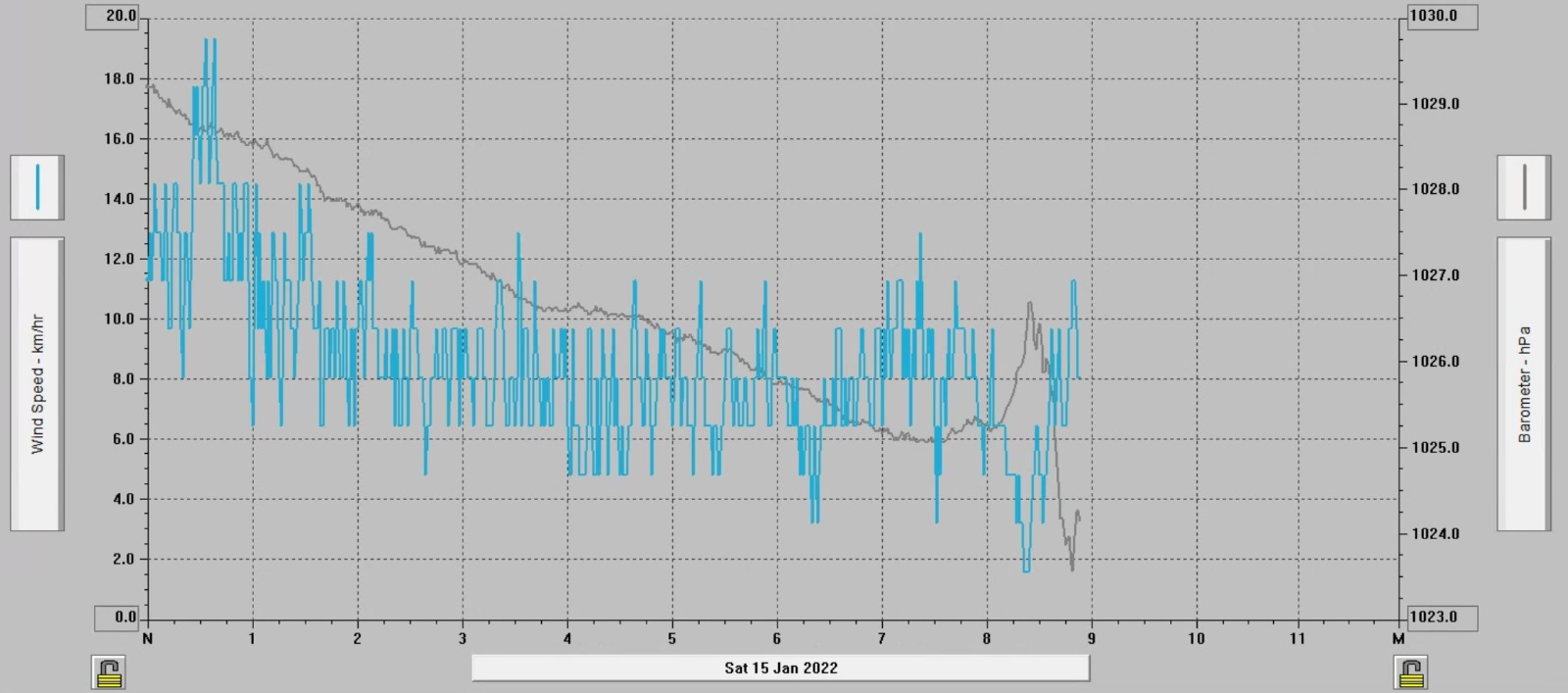 The infrasound waves of Hunga Tonga eruption travelling across New Zealand. First in Auckland, then Wellington, and finally Christchurch.