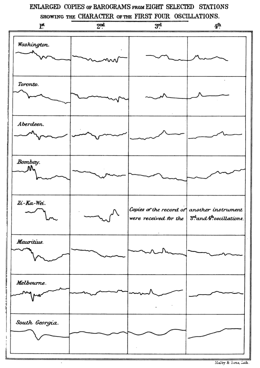 Here are the published pressure measurements of Krakatoa in 1883. Just like today, they show first an increase, followed by a decrease of pressure, and are seen worldwide. The wave was detected 7 times of which 4 are shown. Note that the wave goes around the world both ways, and so passes each place twice coming from opposite directions. So 7 detections means 4 times around the world. The lower pressure part of the wave disappeared after the first round