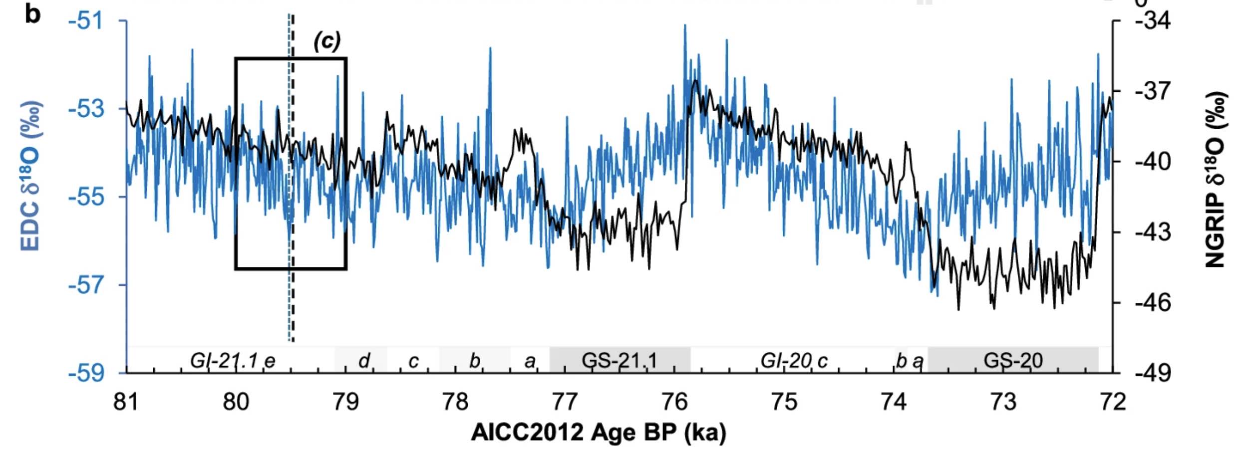 Looking harder, the long cooling started arund 74.2 ka. If the deeper dip is due to Toba, then that cooling is not related to the eruption. The decades-long dip could be eruptive but the 2000-year phase is probably not.