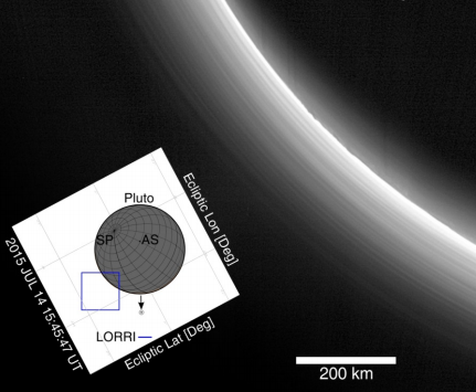 hazes Published 31/08/2016 at 431 × 355 in New Horizons: News from Pluto ← Previous Next → >Haze layers in Pluto’s atmosphere. The outermost layer that can be seen is 200 km high. Source: Gladstone et al., 2016: The Atmosphere of Pluto as Observed by New Horizons