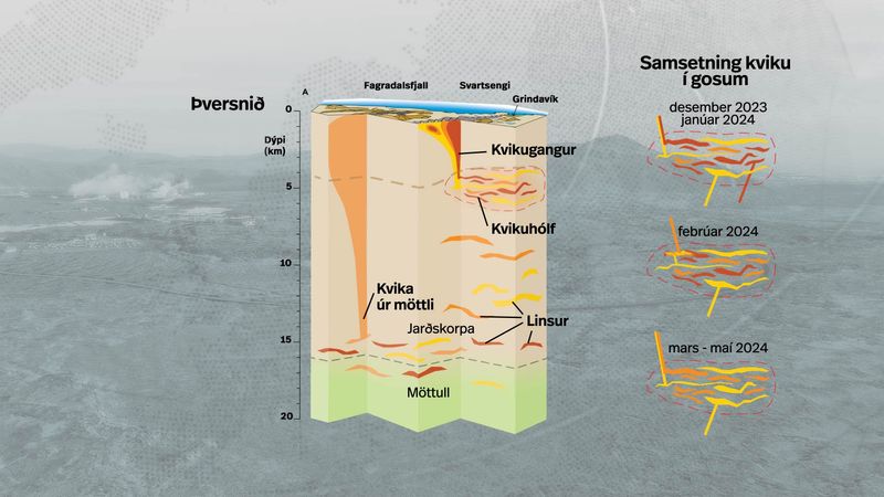 This image shows the paths of magma at Fagradalsfjall and Svartsengi. Fragradalsfjall had relatively simple primitve deep magma, while Svartsengi had a variation of magma from the different magma “Linsur”: