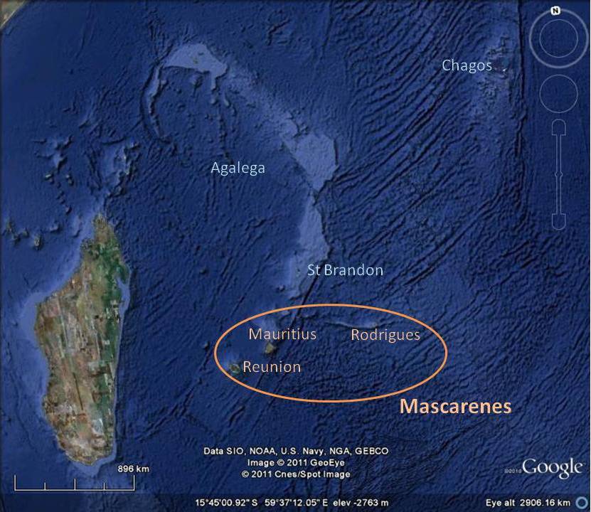 We can extrapolate the sequence backward, to find out when La Reunion first began to form. This uses the total volume of the island, and it gives an age between 5 and 10 million years – the lower age applies if the volcanic activity started out more vigorous than it was at later times. That is about the same time that volcanic activity on Mauritius, 150 km away, began to taper off. The two islands both lie on the Mascarene plateau, the local underwater ridge. They clearly are using the same source of deep magma.
