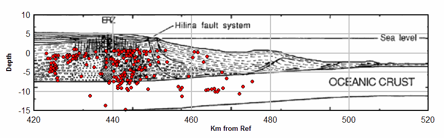 It seems to be the area in the article’s cross section figure, Hilina Slump, above. In the figure it is marked with crosses and commented by the original authors as “generalized location of earthquake hypocentres (Klein et al, 1987)” -> so this zone has been mentioned before as the spot where quakes take place.