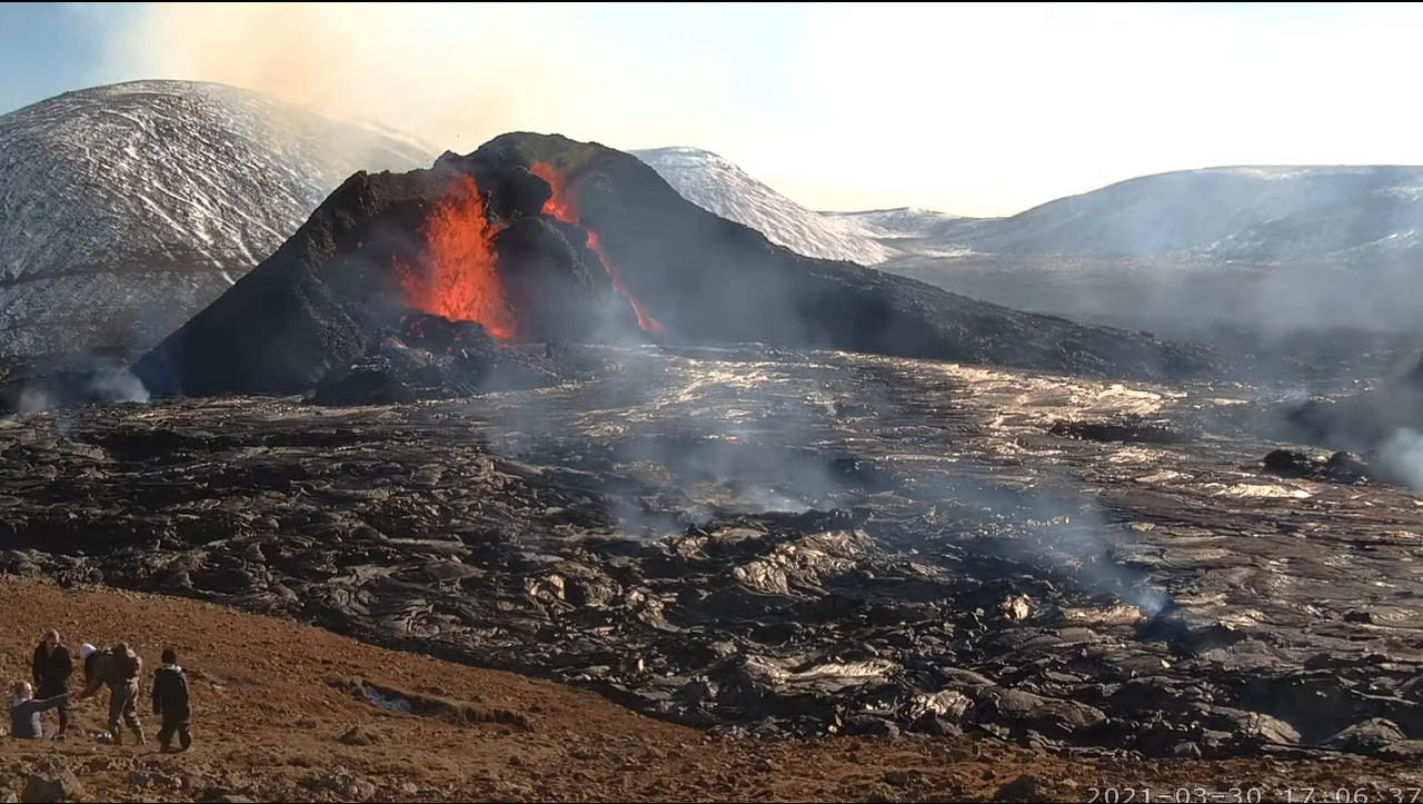 Seems the reason for the many people infront of the RUV cam today, is that the wind has changed so authorities are guiding/herding people to walk on “this” side of the eruption, compared to the streams of people we’ve seen behind the cone the other days.