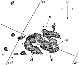 Seeing the outburst to be very rapidly on the increase, and being somewhat flurried by the surprise, I hastily ran to call some one to witness the exhibition with me, and on returning within 60 seconds, was mortified find that it was already much changed and enfeebled. Very shortly afterwards the last trace was gone, and although I maintained a strict watch for nearly an hour, no recurrence took place. The last, traces were at C and D, the patches having travelled considerably from their first position and vanishing as two rapidly fading dots of white light.