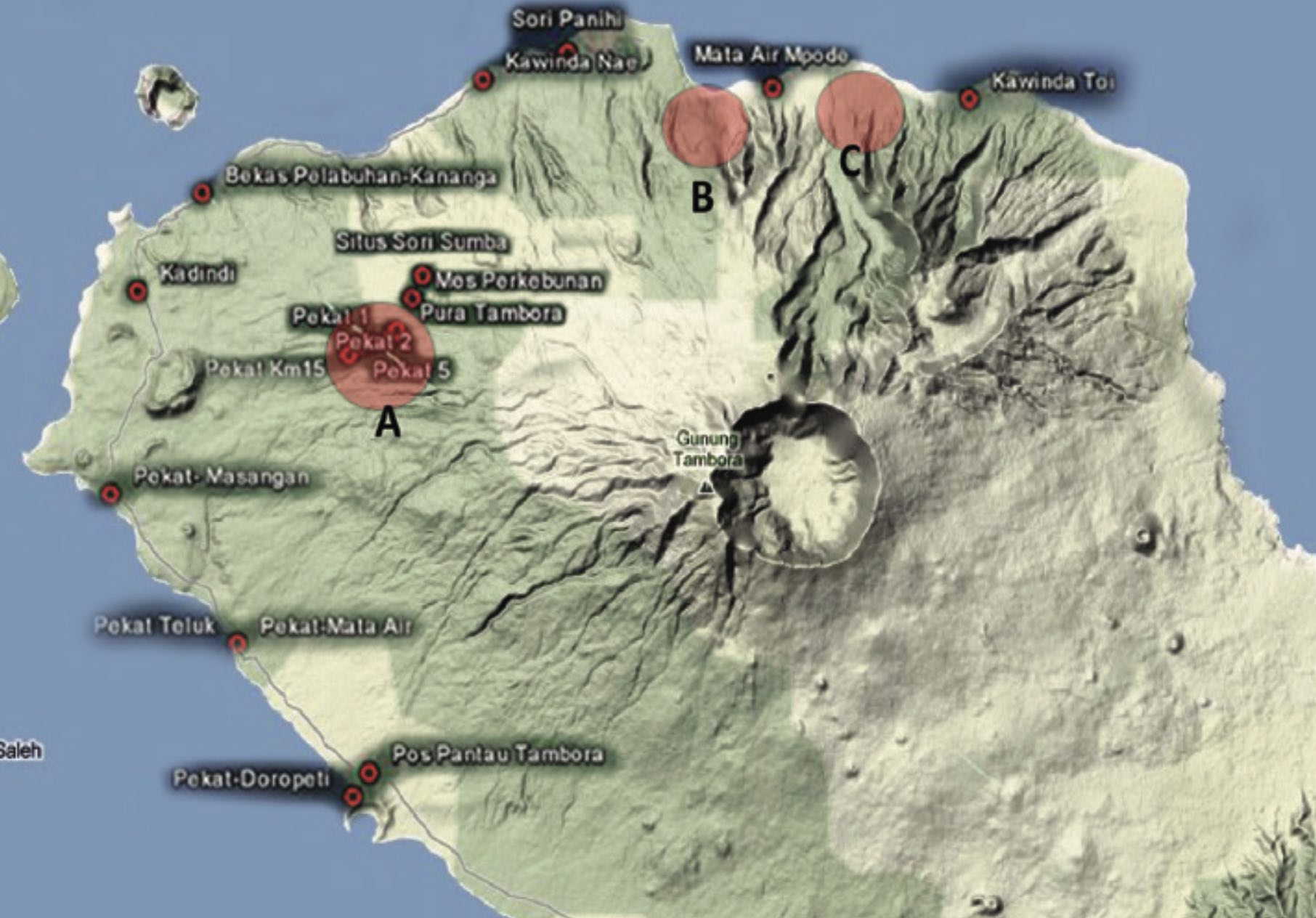 Did the Tamborians come from New Guinea, 4000 years ago? And did they survive for 4000 years in this isolated pocket on the north side of Tambora? The location was a good but isolated one: the mountain slope provided fertile ground, away from the mosquito-ravaged coast but in reach of northern trading routes, while protected by the mountain from the people to the south. After such a long time, it is likely there would have been mixing with the people of the other kingdoms or the trading partners, but evidently the appearance of the people was still different. But after all that time, the very mountain that protected them would become their nemesis.