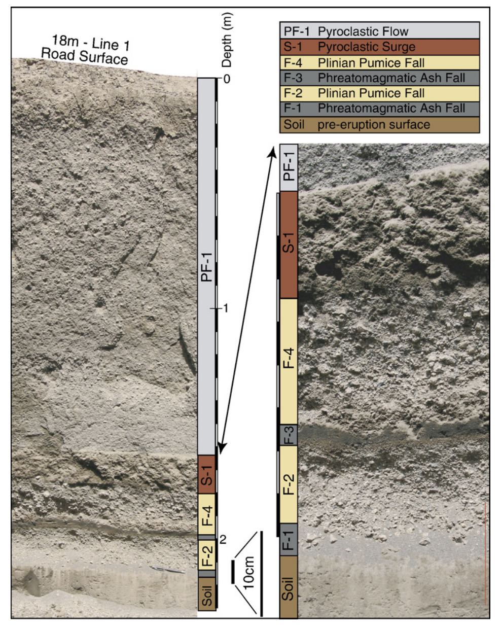 The layering of the volcanic deposits in the area were published in 2007. The layers show the various eruption phases. Layers F1 is probably from the initial eruption on April 5. At this time, the people stayed in the houses. This is probably because the ash layer was initially manageable. The cataclysmic eruption came on April 10, with layers F2-PF1. This eruption came at night and provided no opportunity to flee. The top layer is a double pyroclastic flow, 4 meters deep – and this was 20 km from the summit! The people died in their houses.