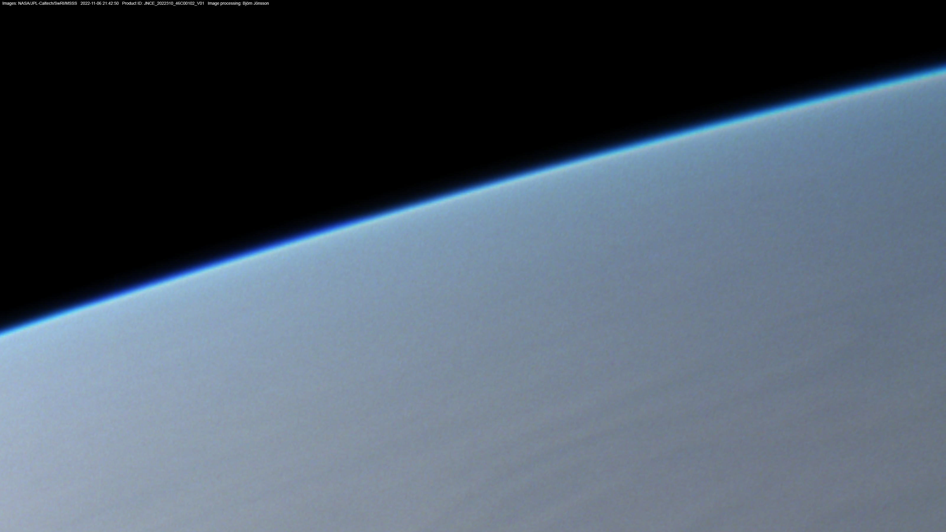 Recent shot from Juno Spacecraft showing Jupiters blue upper atmosphere its the blue edge that sits above its clouds. Hydrogen scatters blue light, so Jupiters stratosphere is blue skies. And nothing is solid here, below the clouds, rain falls into a bottomless pit that gets denser and hotter the deeper down you go. Far below the atmosphere turns into a very hot liquid.