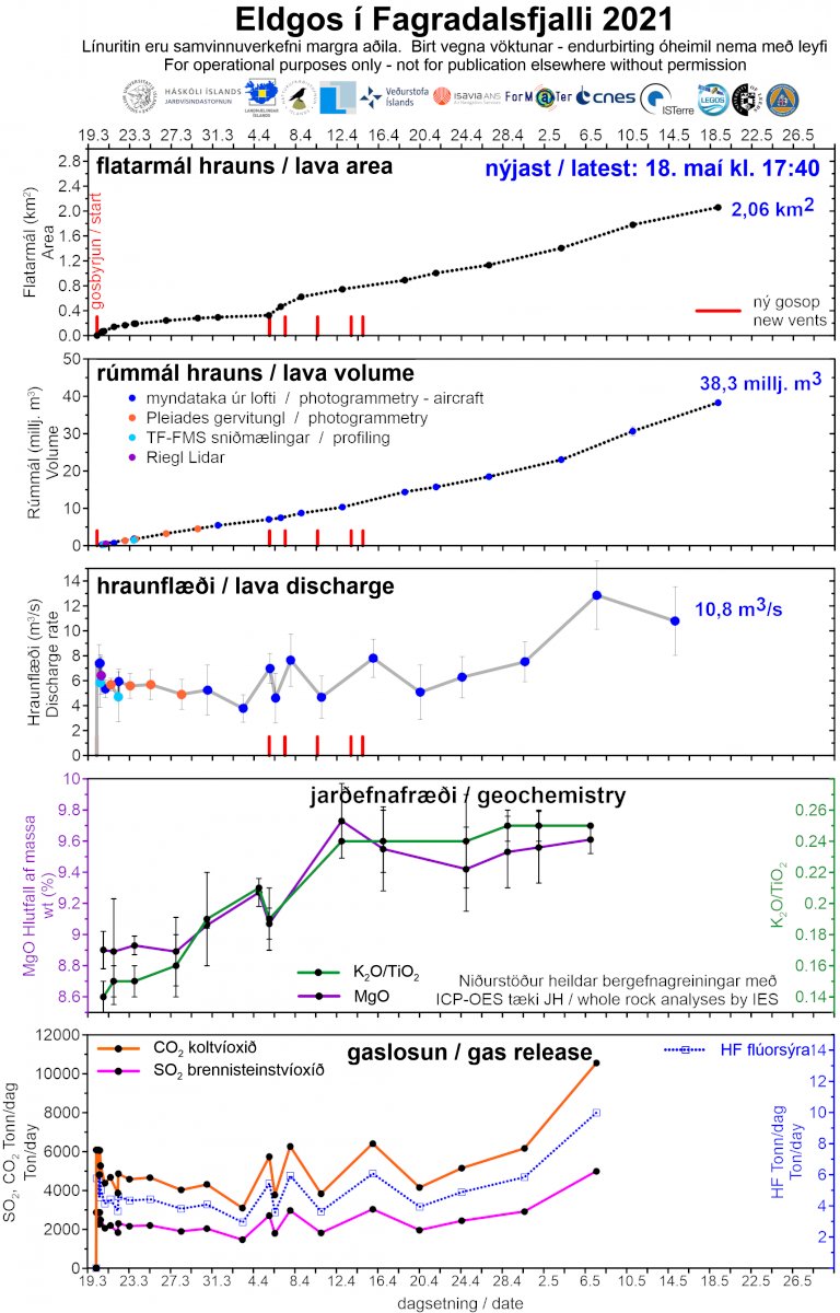 Time for the weekly update to the #Fagradalshraun volume, area and discharge – thanks as always to the Icelandic Institute of Natural History, the Institute of Earth Sciences and the Land Survey of Iceland