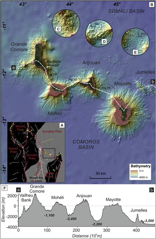 The Comoro Islands form a rough east-west line. This direction already shows it is not related to the off-shore section of the African rift which is nearby but runs north-south. The figure shows a cross section (rather bend) which crosses the main islands. It shows two additional peaks, Vailheu Bank just below sea level and Jumelles at a larger depth. Vailheu Bank is a well-known diving location, good for hammerhead sharks. The deep ocean here is known as one of the few locations where coelacanths still exists, albeit far too deep for divers!