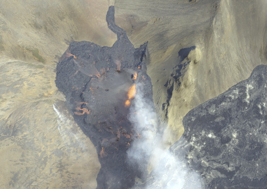 A screenshot from the 3d model, I guess based on a fly-over photo. It shows the raised pond and overflows, and the tentative expansion to the north. Most of the lava goes towards Meradalir but it hasn’t expanded the old lava field there yet