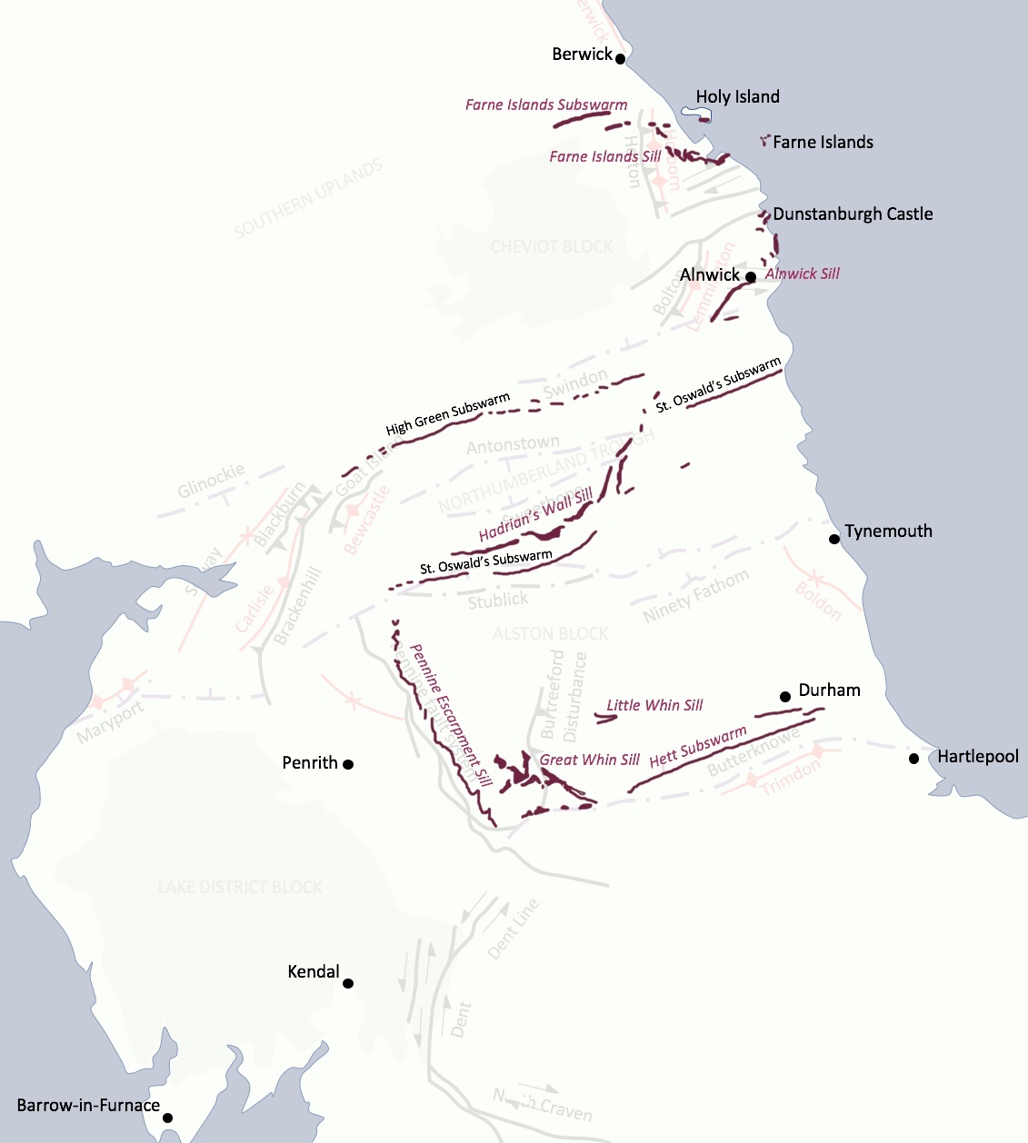 This is a good summary and provides maps. - The Farne Island Sill and Related Dykes