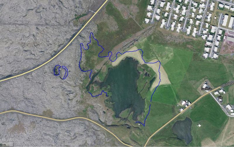 Eruptions are statistical games based on data, and the length of a dyke is indicative of where it will erupt. Thorbjörns dyke has two dyke-legs based on the breakout point (feeder), the shorter leg is the one running East of Bláa Lonid, and the longer leg is running out into the ocean south of Grindavik.