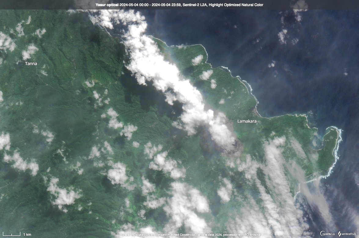 Here is an example from the European Sentinel satellites, with an image of the region around Mount Yasur on Vanuatu. The first image is taken in visible light. The second one combines this with an infrared image. And suddenly, the lava lake at Yasur comes to light.