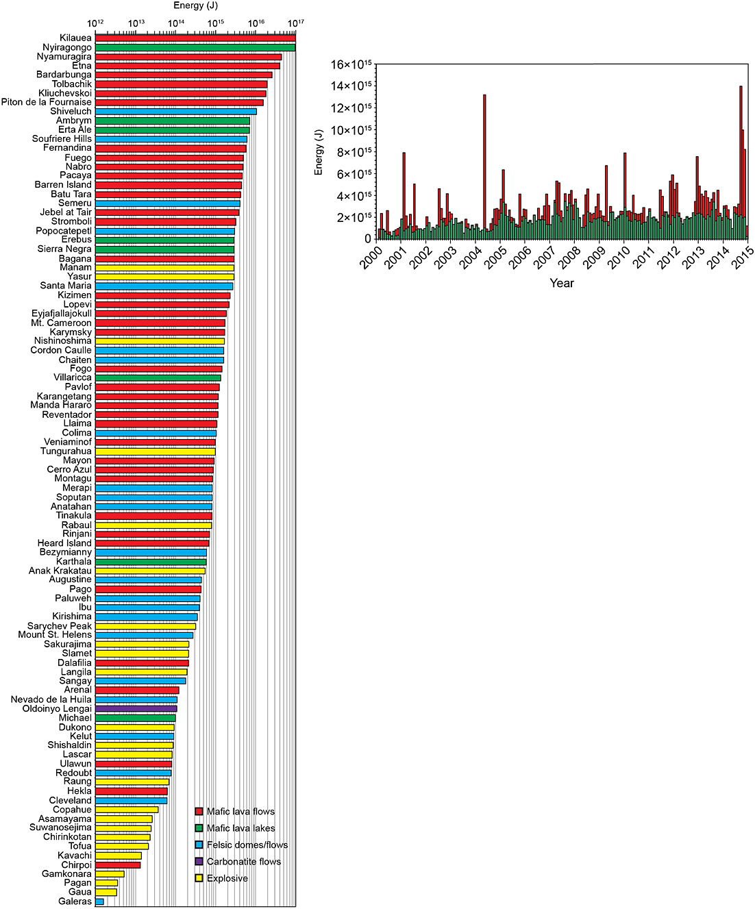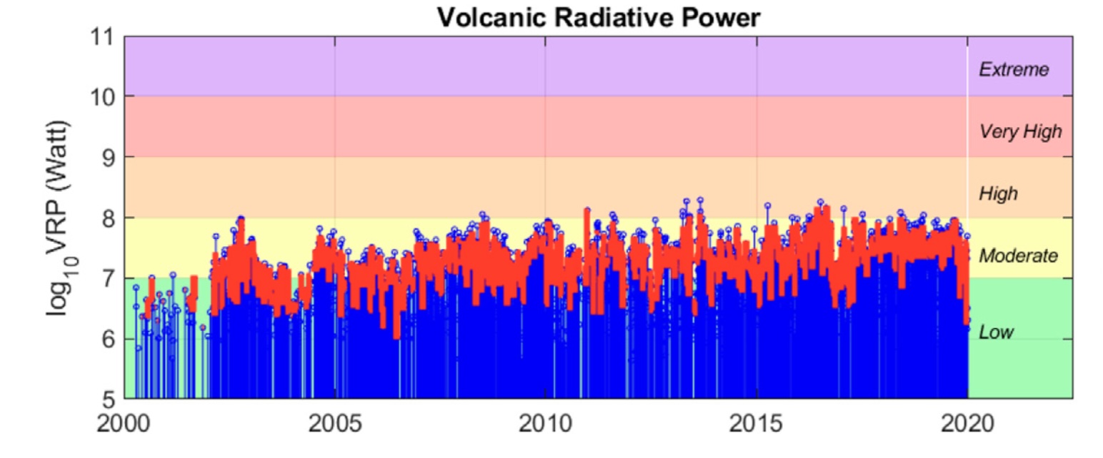 Robert Wright, Matthew Blackett, Charley Hill-Butler :Some observations regarding the thermal flux from Earth’s erupting volcanoes for the period of 2000 to 2014. Geophysical Research Letters, 42, 282-289 (2014). https://agupubs.onlinelibrary.wiley.com/doi/10.1002/2014GL061997
