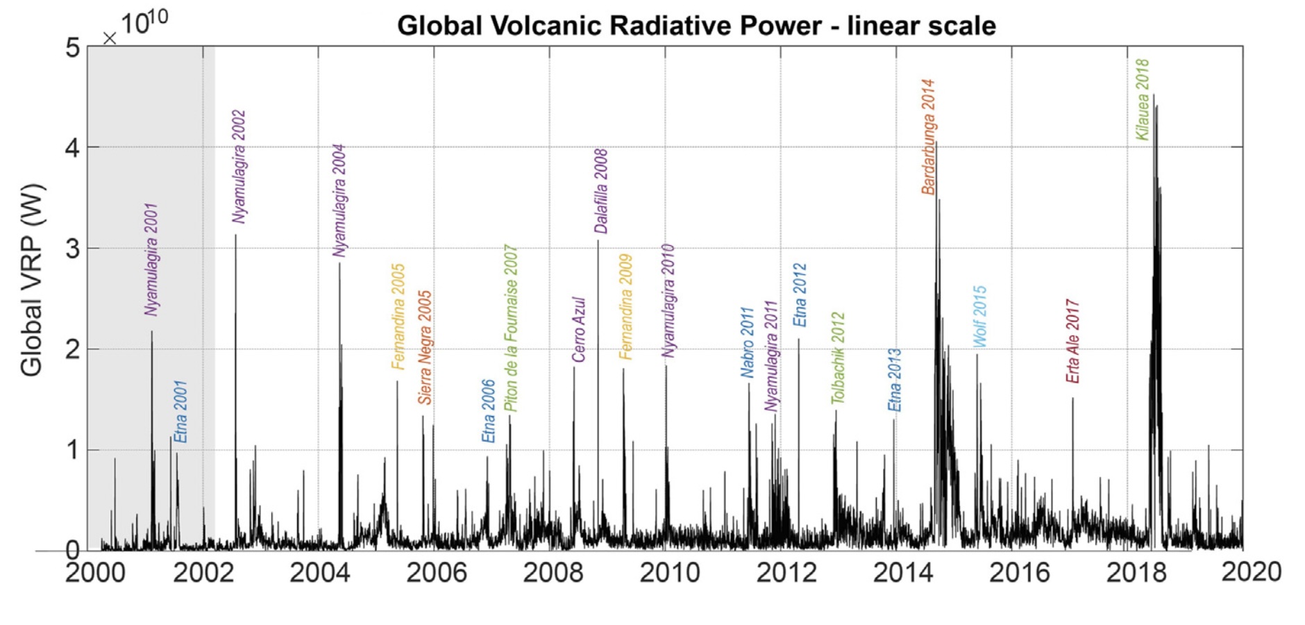 The radiation comes, of course, from the heat, mostly from the lava but part is from hot gas escaping from the volcano. The lava reaches the surface at magma temperatures and then begins to cool. About a third of the heat is emitted while the lava is still liquid. Once the temperature has cooled to some 750C, the lava solidifies by continues to cool. The remainder two-third of the heat energy is emitted by the lava after it solidifies but before it has cooled to room temperature. It can be a slow process. The radiative power initially comes from the liquid lava and later from the solidified, cooler stuff. The power goes down over time, of course, but the total energy still ads up because this lasts a long time. The heat from the lava may also heat the ground and this stored heat can be radiated at a later time. Ground water takes up some of the heat. The volcanic plume carries heat upward in the atmosphere. To a satellite, that does not matter. It observes the site four times a day, 6 hours apart, and detects all the heat that is radiated there, whether directly from the volcano or indirectly from the air or the ground. Don’t expect detail, though: each measurement covers 1 square kilometer.