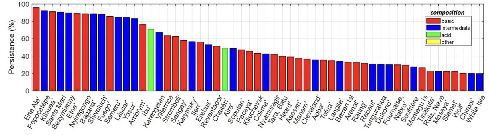 The persistence can come in different ways. A lava lake is a big help. An open conduit can act as well (Yasur). Finally, a lava dome also creates persistence, as seen for Popocatépetl.