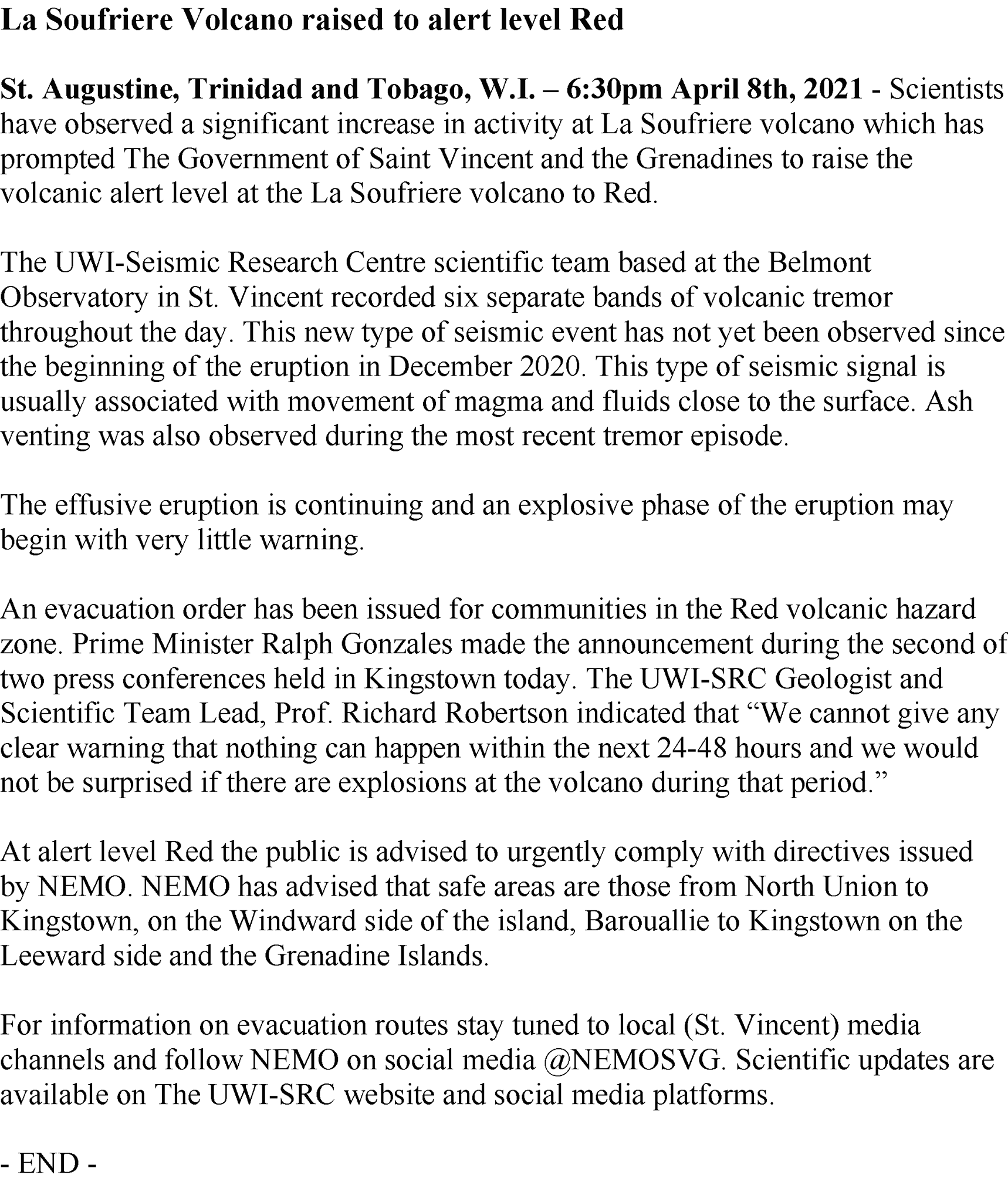 Substantial prospect of disaster. Level 3 declared by Prime Minister. NEMO boss tells residents to “be ready, get your things in order.” #lasoufriereeruption#beready