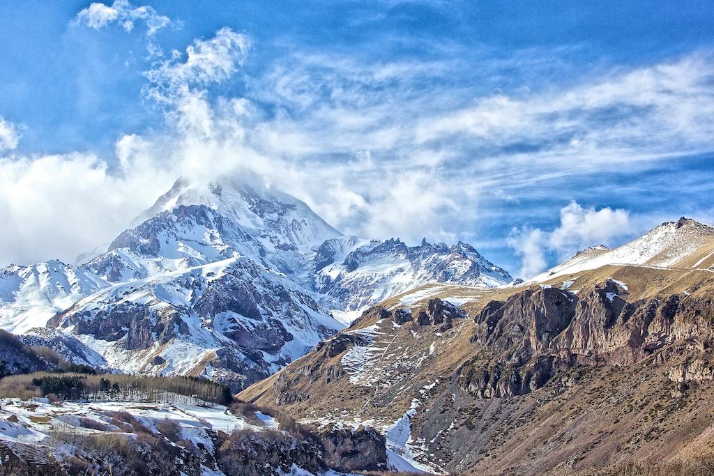 It is an impressive mountain in an impressive region. The peak lies at the centre of the Caucasus range, at the border between Russia and Georgia. At 5047 m (16,560 ft), it is the second tallest volcano in Europe. According to a Georgian legend, a cave high on the mountain contains various relics, including Abraham’s tent and the manger of baby Jesus. The shape of the stratovolcano is rugged, reflecting a long history of erosion, a volcano past its prime. Ancient lava flows have spread some 15 kilometer, mainly to the south and filling in the ancient river valleys. Like Elbrus, it is an extended volcanic centre which has been in the same location for half a million years. And like Elbrus, this is not just a relic: there is still life left in it.
