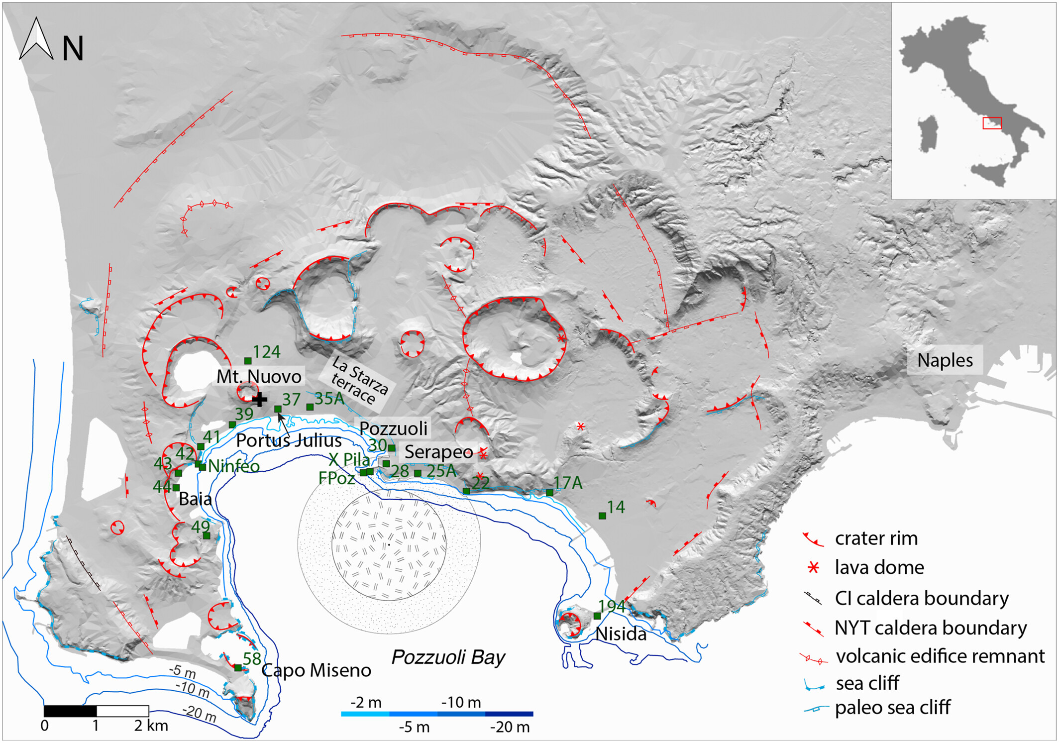 The uplifted block is on-land near the coastal town of Pozzuoli. The well known sulphur field, Solfatara, is also associated with this block. Another locus of activity exists off-shore, at the centre of the Bay of Pozzuoli. Both sites, near the city and in the centre of the Bay, show tectonic earthquake activity. It is all in the faults. There is a bit of folding in the region, with one side (the anticline) near Pozzuoli and the other side (the syncline) in the Bay. The uplift has been focussed on the anticline whilst the syncline is a location for magma upwelling.