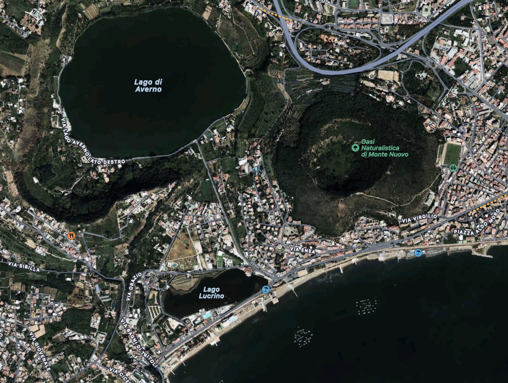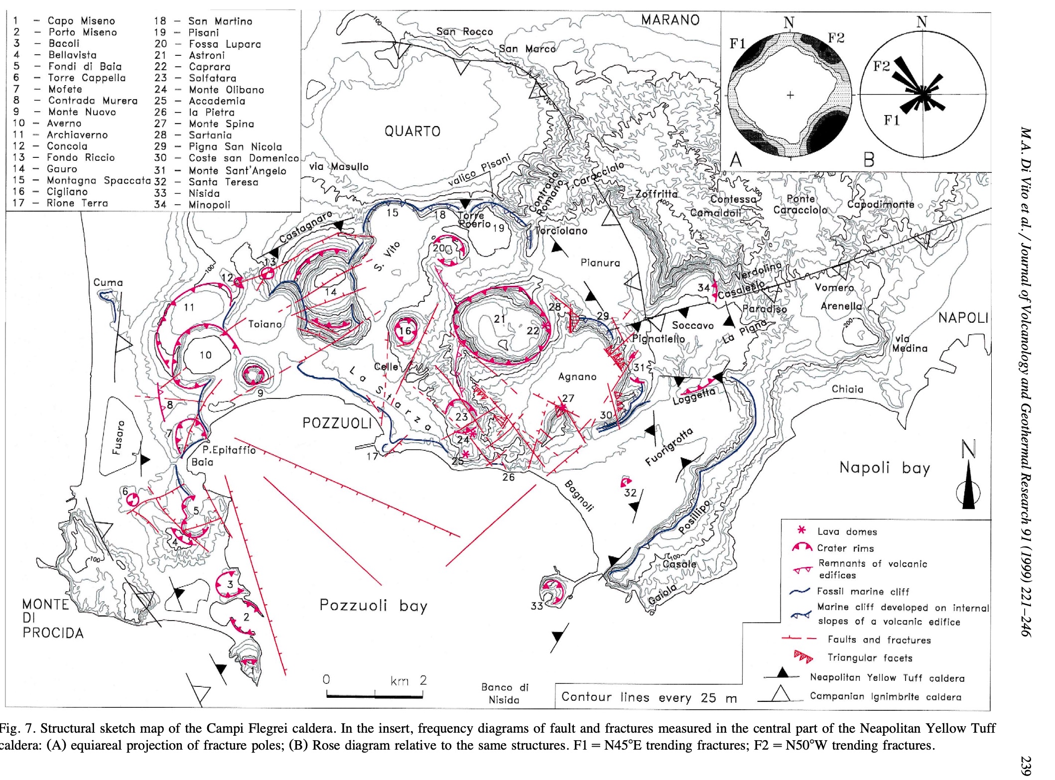 The map shows the current lay of the land. Lake Lucrino was well known in Roman times. It was separated from the sea by a sea wall and was used as a harbour. A canal ran to Lake Averno, and this lake at one time provided safe shelter for the Roman fleet. The outlines of the lake were changed by the new hill. The first vent was in the bay but avoided Lake Lucrino. It may have been south or southeast of Monte Nuova. That would put Tripergole underneath the southern side of Monte Nuova, and suggests the first rift extended between the summit and the sea.