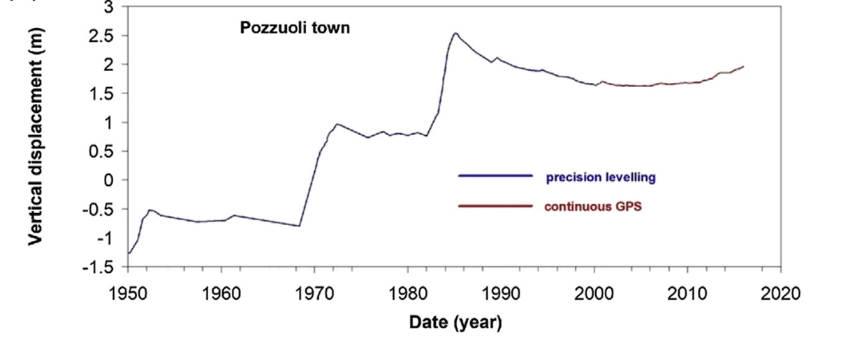 There is nothing unusual about the recent changes. Ground levels here have long been changeable. The Roman pillars at the old market of Pozzuoli show that the village was well above sea level in their days, 2000 years ago. But damage done to the pillars by marine organisms show that at later times they were submerged by more than 7 meters! There is one drawing from the Middle Ages showing the pillars sticking out from the sea, with the market square itself below the water line.