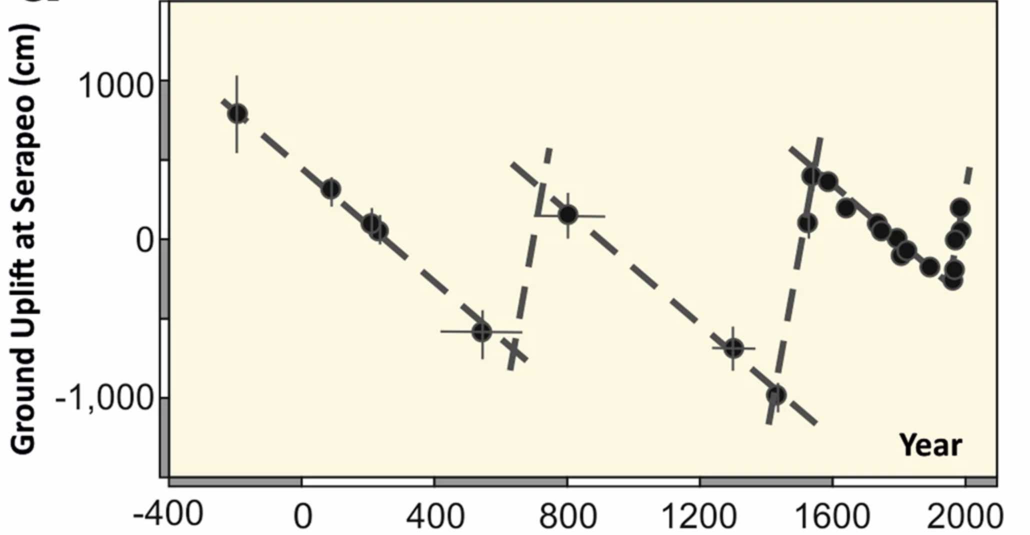 More detailed studies have used the Serapeum pillars mentioned above, by carbon dating the marine bore holes. When the market was first built, the floor was 13 meters above sea level. Around 200 AD, a new floor was constructed, raised by 2 meters above the previous one. Was this because of intruding sea water? Another restoration took place in 394, so at that time the market was not yet flooded. By 540 AD (from the carbon dating) the pillars were submerged by 7 meters. This indicates rapid subsidence in the 5th century, by as much as 15 cm per year. Such rapid change can only come from migration of underground water. In fact, during 1986 a similar rate of subsidence was reached in Pozzuoli, and this was attributed to loss of pressure in the water system that feeds the fumaroles of Solfatara.