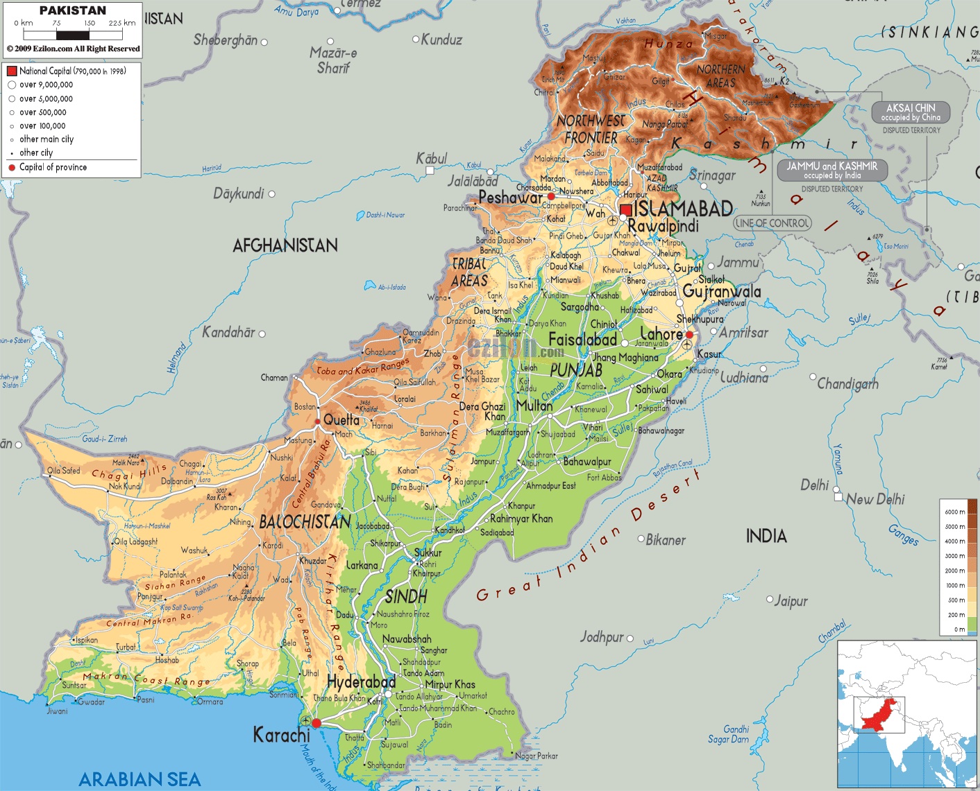Many more, but lower, mountain ranges occupy the west of the country. The map below shows the names and location of the various ranges. Heights vary from 1 to 5 kilometers. The curved chains of the Sulaiman range give spectacular satellite images. They form a fold belt at the edge of the Indus delta; the peculiar shape is related to some rotation of the Indian plate in its collision with Asia. Everything here is India’s fault.