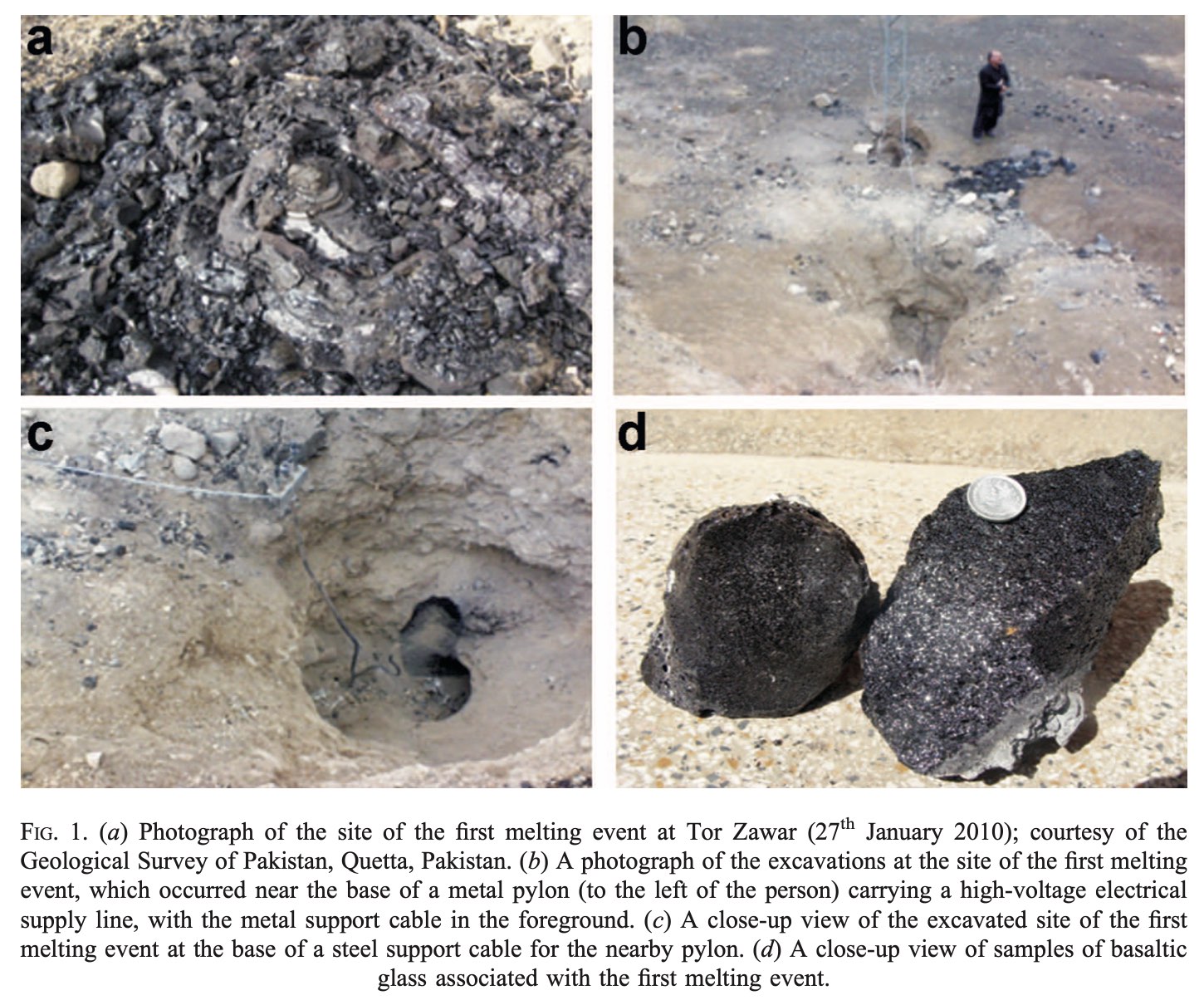 The eruption site was close to an electricity pylon, and the cable reportedly had snapped, apparently in the earthquake. ‘Close’ meant a distance of some 7 meters. But this could not have caused the melt. The cable had been overhead, not buried, and any melt from its short-circuit would have been on the surface. In fact, there are cases known where a broken electricity cable melted surface rocks. But at Tor Zawar the molten rock had definitely come from below. Also, the basaltic composition of the analyzed stone would have required a very high melt fraction of the surface rocks, much higher than expected from a short-circuit. So that suggestion did not work.