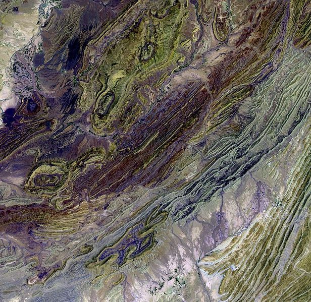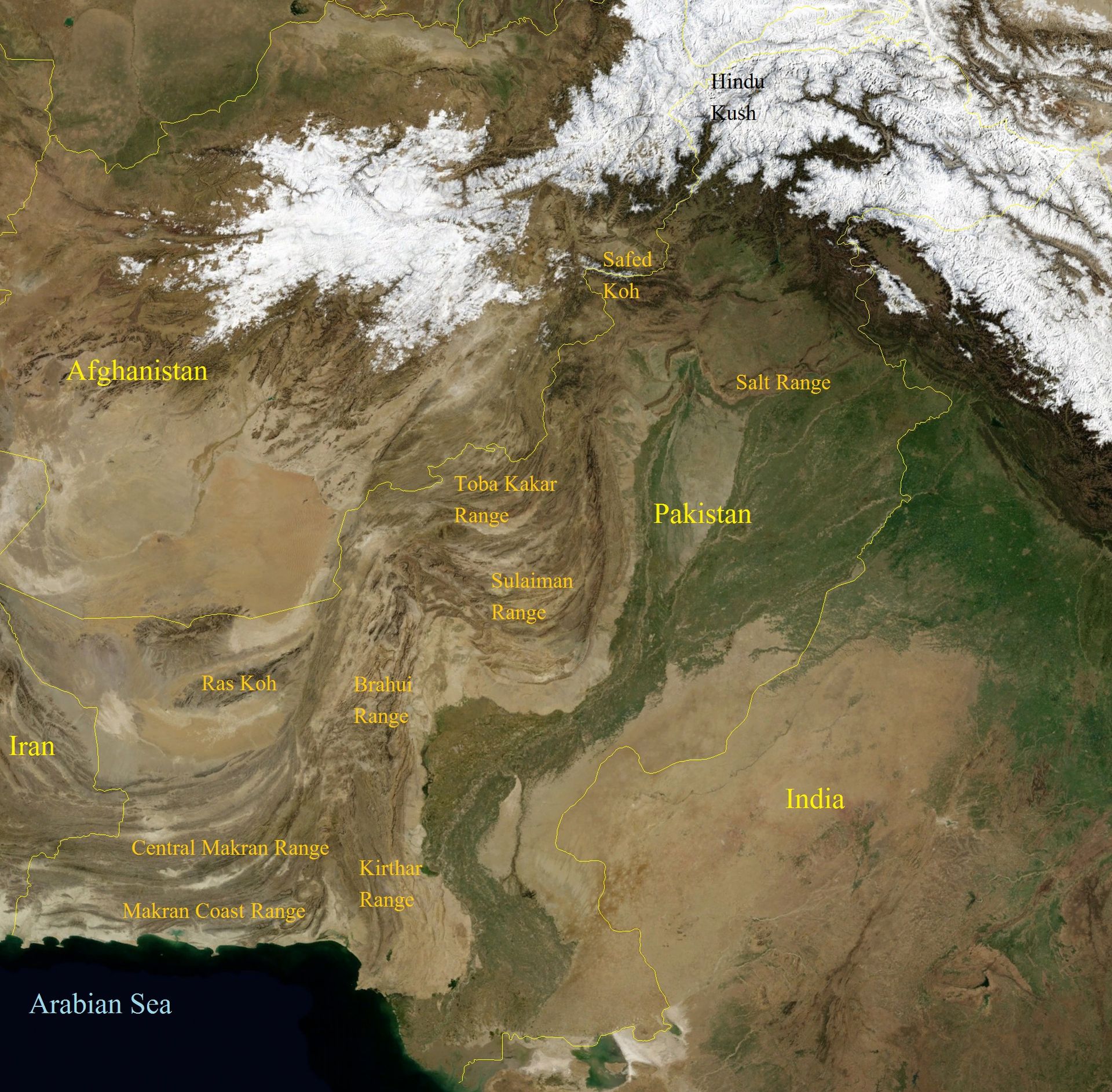 It all happened in a mountainous region of Pakistan. The country is a fractured one. It lies on one of the boundaries between the Eurasian and the Indian plate, and carries collateral damage from the collision of the two. Pakistan borders India, China, Afghanistan and Iran. (Not all the borders are well defined.) The eastern parts of the country are the fertile delta of the Indus river, among the major rivers of the world, and the origin of the name ‘India’. East of the Indus the land is dry and bare: this is the Thar desert which extends into India. In the far north is the final flourish of the Himalayas, where the gorge of the Indus defines its westernmost extend. The Himalayas took the brunt of the India-Asia collision: it is the crumple zone of a continent. The western half of Pakistan is very different, with long curved mountain chains along the edge of the Indian plate.