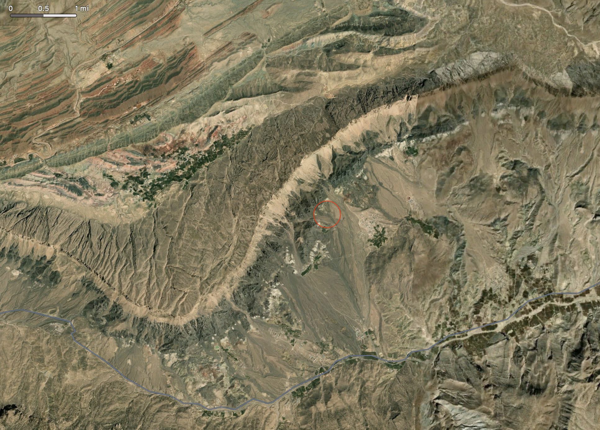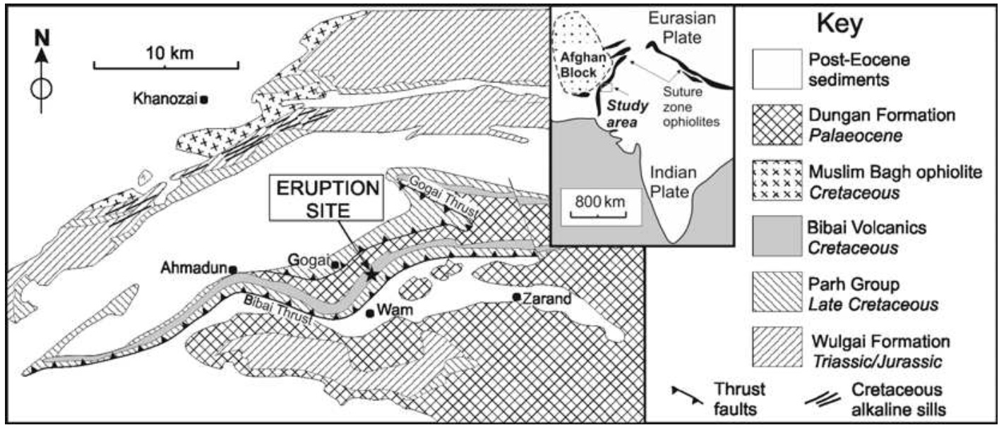 Once, this was within the Tethys ocean. India’s venture into Asia was part of the closure of the Tethys, some 50 million years ago. (It was not the first, nor the last, terrain to make the jump. A series of microcontinents and volcanic islands had done the same, arriving ahead of India.) In this particular region, the rocks date from the Jurassic to the Eocene (the time of India’s arrival). They are mainly sedimentary, sand and debris deposited in the Tethys ocean. But in the late Cretaceous, 70-74 million years ago and ahead of India’s arrival at the shores of Asia, there was a period of basaltic volcanism with submarine pillow lavas and tuff. The remains of these volcanic rocks, interspersed with sediment (sandstone and mudstone) are now found on land, in the region of Tor Zawar. At the surface there is a thin band of volcanic rock stretching east to west over a length of 10km and a width of 1-2 km. Satellite images show the band of dark rock well. It is called the Bibai volcanics and lies between two thrust faults, the Bibai and Gogai thrusts. Tor Zawar is at the southern rim of this band, and this where the eruption took place. Further north, the mountains show sills, attributed to the same ancient volcanic event. They consist of dolerite, typical for solidified basaltic dikes and sills. The Bibai volcanics may have been a local intrusion but it occurred over a wider region than just the thin band now at the surface. Was this related to the eruption? It would be a record long lead time!