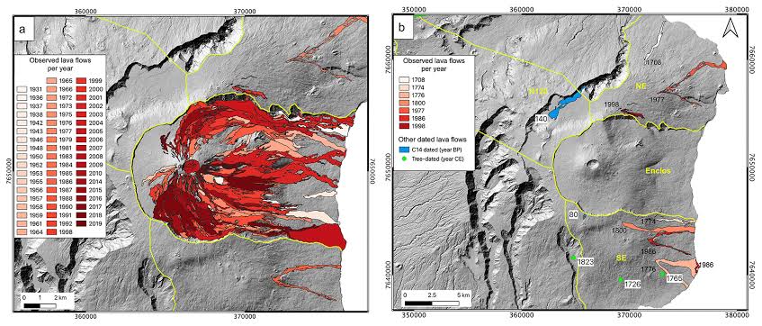 The thing I am most curious about is the complete lack of any eruptions inside the Dolemieu crater in the last decade. There were a couple eruptions in it between 2007 and 2010 but before 2007 it was often active for months at a time and many eruptions started inside it. But now it is dead quiet, while eruptions have happened as many as five times in one year and on all four flanks since 2014. Kilauea immediately went into filling its caldera and has not done anything else after 2018, but Piton has done almost the opposite.