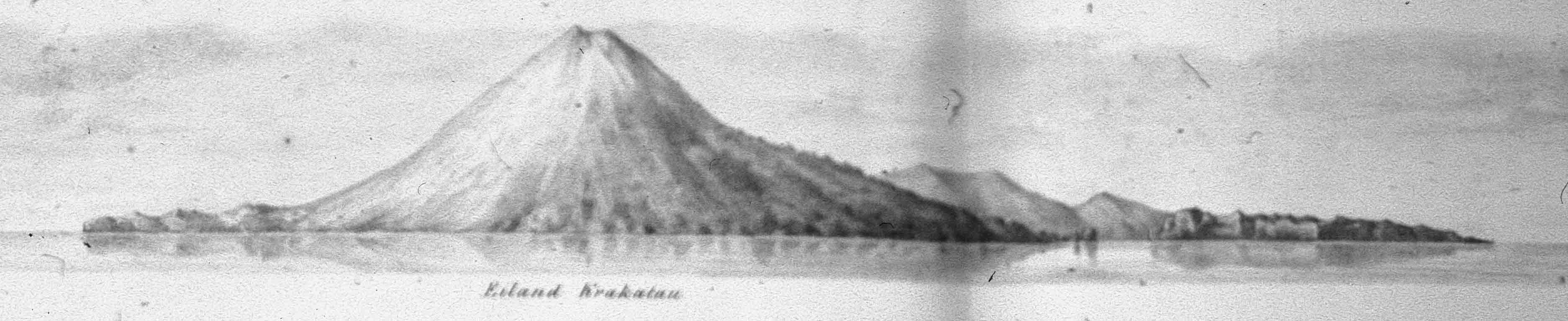 Before the eruption, Krakatau was a decent-sized but not particularly tall island. There were several volcanoes on the island. The main peak, Rakata, may have been dormant: the descriptions indicate that the 1883 eruptions were from multiple (simultaneous) vents along the Danan-Perboewatan line. These are the lower cones in the background of this pre-1883 drawing. The main explosion, after four months of activity, may have been at Danan. In the last few weeks before the main event the volcanic activity had been steadily increasing. A few months earlier, a picnic party had come from Jakarta to view the eruption. Two weeks before the final flourish, the main geologist (Verbeek) had refused to go on land in view of the danger.