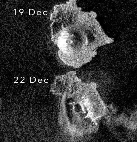 A combination of synthetic aperture radar images taken by JAXA’s ALOS-2 satellite and analyzed by Geospatial Information Authority of Japan, before and after the Dec. 22, 2018, eruption. The images were taken on Aug. 20, 2018, left, and on Dec. 24, 2018, right, respectively.