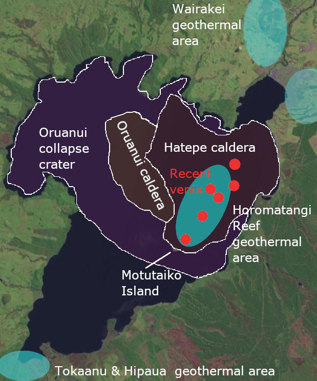 Together, the faults delineate a rift system. New Zealand’s rift runs from the Bay of Plenty in the north southwards, but the amount of rifting decreases southwards to zero south of Taupo. In a rift, the extension causes subsidence: the faults accommodate this subsidence. North of Taupo, there is evidence for 40 meters of subsidence in the rift since the VEI-8 eruption 25,000 years ago. The Kapaio fault over the past 40 years has shown subsidence to the west and inflation to the east , consistent with rifting. But over the long term, Lake Taupo shows no subsidence. The subsidence must be compensated by the amount of magma entering the region. Here, tectonic subsidence and volcanic inflation give a zero net sum. Now throw in the frequent caldera collapse (and there are many calderas in the region, of all ages). Lake Taupo is both a collapsed caldera and a subsiding rift, located around an inflating region where magma appears to have moved up. For added complexity, you may also consider the geothermal activity which suggests the presence of circulating hot water which can also cause local inflation and subsidence.