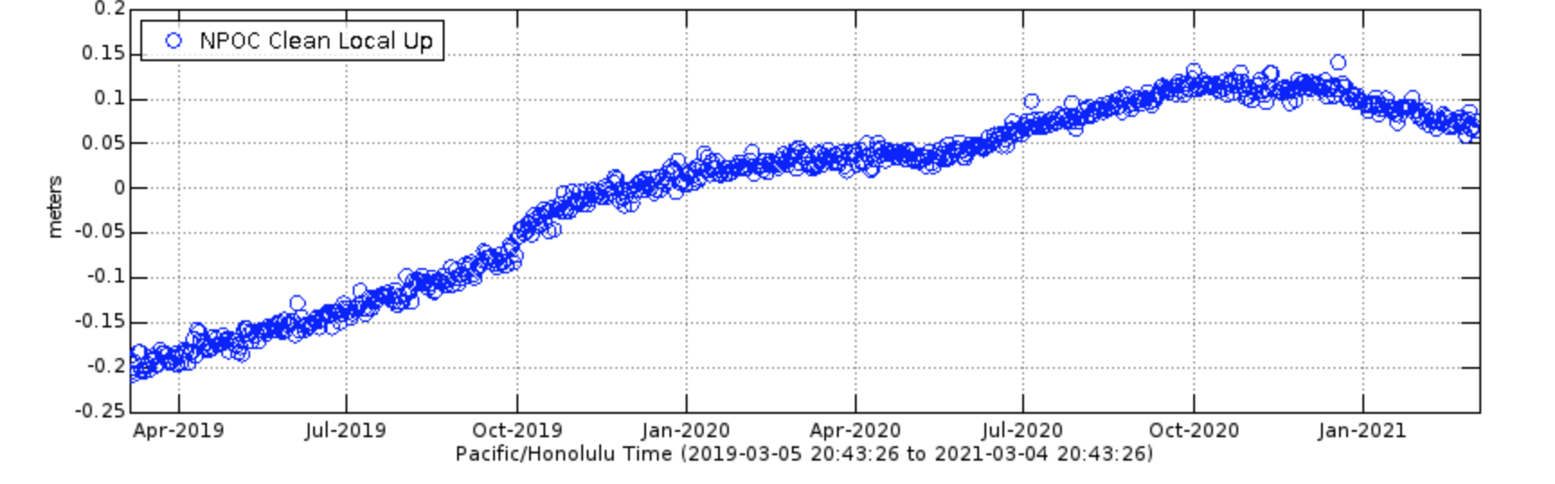 Additionally, the 10 year GPS data for CRIM goes back far enough to cover a number of extreme weather events, including two hurricanes, yet there is no deviation associated with any of them even though Lane broke the record for the most rain in Hilo, which is one of the rainiest cities on Earth. The recent signal does show on that plot too which is much more smooth due to its size. It is true that we will need to wait a while to see if it is a trend, but it looks pretty real.