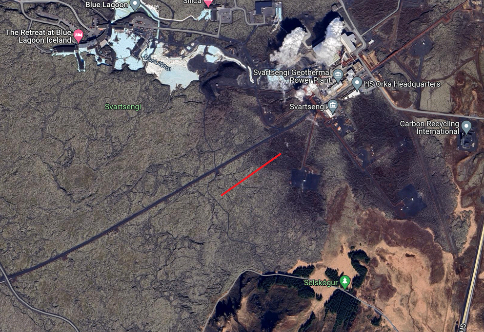 From what I can tell, the increased ground temperature shown in the main picture in the news article at https://www.mbl.is/frettir/innlent/2023/11/05/dronamyndir_syna_hitann_i_illahrauni/ roughly corresponds to the red line I’ve made in the picture below.