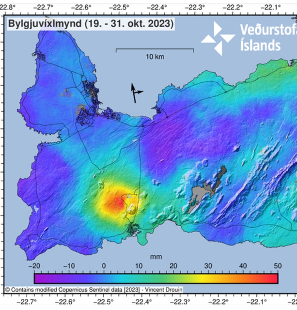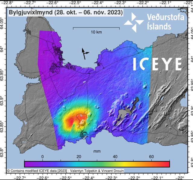 Uplift continues at a similar rate as before according to Satellite and GNSS data. Interferogram (InSAR) for the period 28th of October – 6th of November showing near-vertical motion confirms this, but it also shows offsets due to fault movements associated with the seismic activity. Updated models based on the same data estimate that magma continues to accumulate in a horizontal sill at a depth of about 5 km and since the beginning of the inflation event (October 27th) the average inflow is estimated about 5 m3/s (uncertainty is ±2 m3/s)””