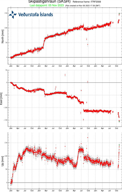 Skipastigshrraun stopped going north and Eldvörp has started to move south for several days now. Meantime uplift still is ongoing at those stations. I think the centre of the uplift has moved.
